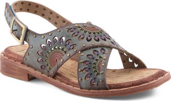 Laser-cut perforations and antique studs highlight the hand-painted leather upper of a slingback sandal grounded by a cushioned footbed and low, stacked heel.
