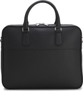 Keep your documents and other important work essentials organized and secure with this slim briefcase made of smooth and textured leather.