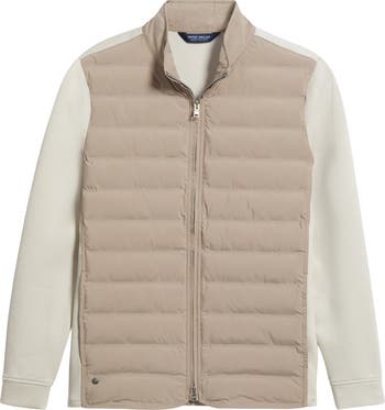 The unparalleled warmth of a puffer meets the flexible, stretchy comfort of an athletic jacket with this golf-geared hybrid featuring a channel-quilted body contrasted by stretchy three-layer mèlange.
