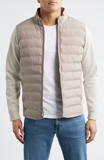 The unparalleled warmth of a puffer meets the flexible, stretchy comfort of an athletic jacket with this golf-geared hybrid featuring a channel-quilted body contrasted by stretchy three-layer mèlange.
