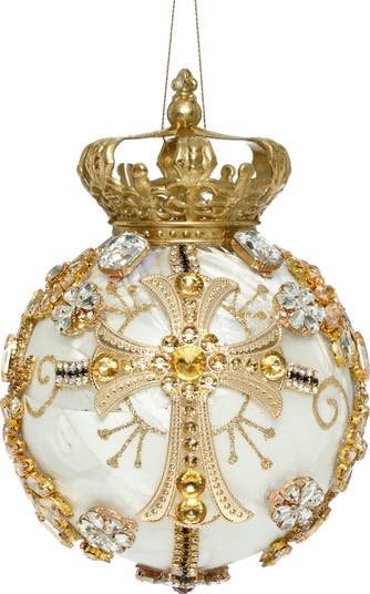 This ivory ornament is a regal masterpiece, adorned with radiant jewels and intricate golden details. A majestic crown rests atop, symbolizing luxury and nobility. Its shimmering cross and gemstone embellishments make it a stunning centerpiece for any elegant holiday display.