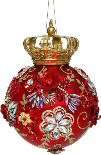 This is a luxurious red Christmas ornament adorned with jeweled floral designs and shimmering gold accents. It features sparkling gemstones and sequins arranged in intricate patterns, giving it a regal, opulent appearance. The ornament is topped with a golden crown, adding a royal touch perfect for an elegant holiday display.
