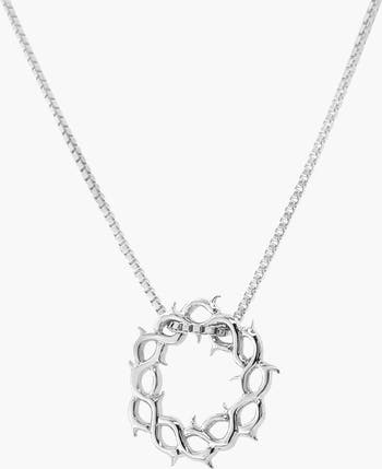 18k generously gold-plated sterling silver crown of thorns pendant intricately woven onto a box chain with adjustable slider. Inspired by Hebrews 10:12-14. Each unique piece in this collection symbolizes the singular, sacred act of the heavenly King. The intricate design represents both a piercing anguish and an enduring atonement rich in spiritual sentiment.