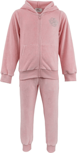 Soft pink velour hoodie set featuring a charming crown design embellished with delicate glitter details, perfect for a royal-inspired look. Includes a zip-up hoodie and matching jogger pants, offering comfort and style for casual outings. The hoodie’s front and back crown detail adds a magical touch to this chic, relaxed set.