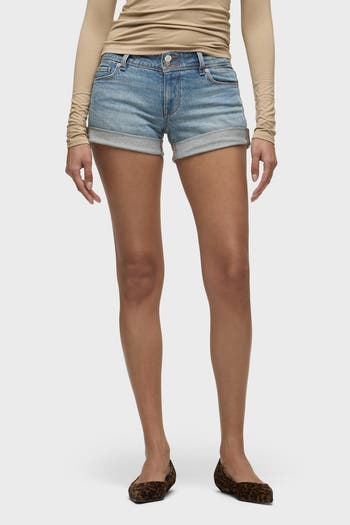 Featuring our signature original flap pocket with the Union Jack flag, the Croxley Mid-Rise Short in Snow Drops features a rolled-hem staple that hits right above mid-thigh. This pair is cut from comfort stretch denim made of recycled cotton in a vintage-inspired light indigo wash.Product DetailsFront Rise: 8.5", Leg Opening: 22.5", Inseam: 3.5"Fit & CareContent:98% Cotton, 2% Elastane Machine wash cold gentle cycle Only non-chlorine bleach when needed Tumble dry low Medium iron if needed