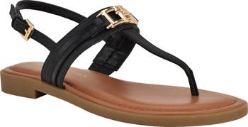 Glinting logo hardware adds a signature flourish to a faux-leather sandal secured by a center toe post and adjustable slingback strap.
