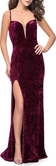 Get noticed in this sexy crushed velvet form-fitting dress with a sweetheart V neckline. Featuring a side leg slit and an open strappy back. Back zipper closure.