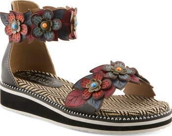 Colorful floral appliqués adorn the straps on a platform sandal rendered in natural tanned leather with a hand-painted finish for artistic flair.