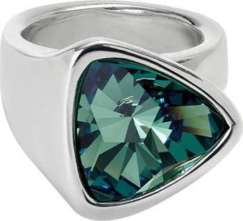 A polished band frames a vivid, emerald-toned crystal that sits flush with the surface, creating a crisp pop of color against the cool sterling plating.