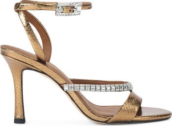 Lustrous crystal embellishments and a signature eagle head bring stunning opulence to a soirée-ready sandal set on a svelte heel and secure by an adjustable buckle closure.