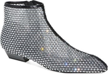 Sparkling crystal embellishments add glamorous luster to the mesh upper of a party-ready bootie fitted with a side zipper for easy entry.