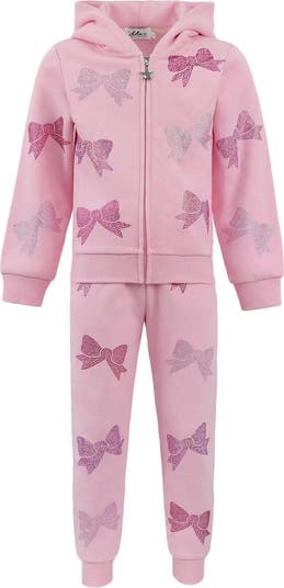 Stylish pink jogger set adorned with sparkling crystal bow embellishments. Hoodie features a front zipper and ribbed cuffs for a snug fit. Jogger pants come with an elastic waistband and ribbed ankle cuffs for comfort and ease of movement.