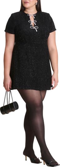 This tweed mini dress brings all the charm—thanks especially to crystal-bow details & a chic back cutout. Fully lined and cut with short sleeves, it’s a modern nod to classic Parisian style. Pair yours with sheer tights & just-as-sparkly jewels.