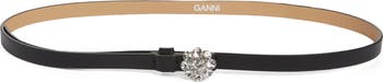A crystal-embellished buckle centers this slim belt made from recycled leather.