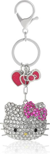 Signature sparkle. Hello Kitty’s head is fully covered in clear crystals with a hot‑pink bow and glitter heart charms. Polished silver‑tone hardware clips to keys and bags in a snap.