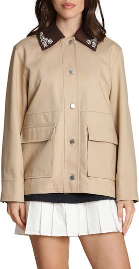 Workwear gets a glow-up when a sturdy chore jacket is embellished with sparkling rhinestones on the contrast collar.