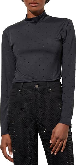 Subtle sparkle animates a smooth jersey top done with a neat mock neck.