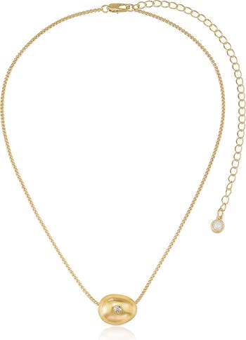 A dainty crystal sparkles from an organically shaped pebble pendant necklace plated in glossy 18-karat gold.
