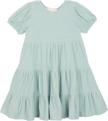This girls' dress in soft sage green features a delicate textured pattern and a flowy tiered skirt for graceful movement. Designed with puff sleeves and a V-neckline, it blends elegance with everyday comfort. The lightweight fabric ensures breathability, making it a perfect choice for special occasions or casual outings.