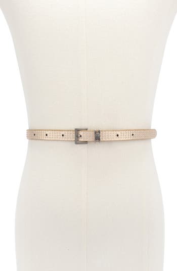 Sparkly crystals dial up the glamour of this shimmery metallic belt framed by a burnished square buckle and signature eagle's-head hardware.