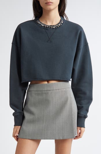 Cabochon crystals lend a hint of shine to this cotton sweatshirt perfectly balanced by its relaxed rolled cropped hem.