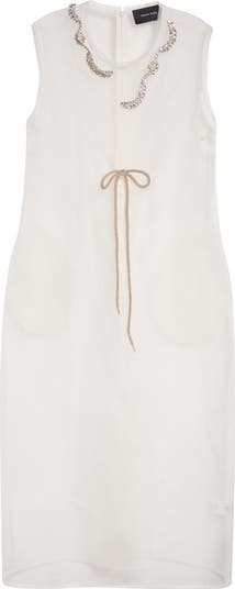 From the Irish designer's spring '26 ode to girlhood, this sheer silk-organza column dress is playfully adorned with a fuzzy chenille bow and a segmented strand of crystals and faux pearls seemingly borrowed from a loved one's jewelry box.