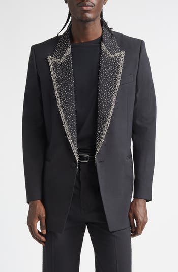 This season, Mike Amiri salutes his eponymous label's LA roots with a glitzy tribute to Tinseltown. One star standout: this wool-enriched blazer with peaked lapels decorated in scores of lustrous beads and sparkling crystals—an homage to the bright lights of Hollywood.