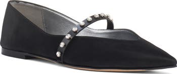 Chunky crystals embellish the slender mary jane strap of an Italian-crafted flat designed with a softly dipped topline and sharp pointy toe.