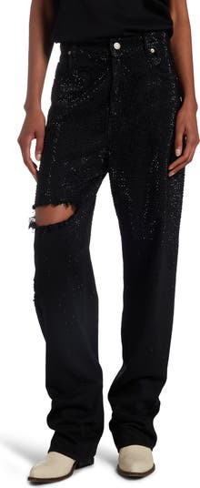 Inspired by everyday glamour in the City of Lights, glittering crystals decorate these ripped straight-leg jeans made from nonstretch Italian denim.