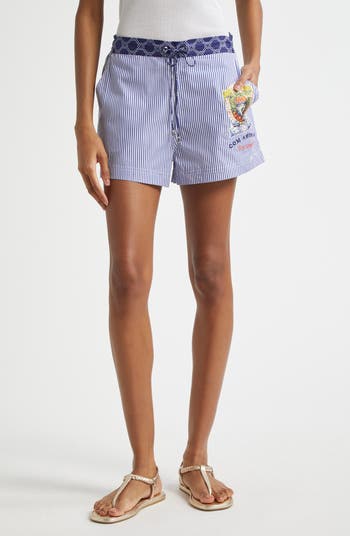 Classic stripes buoy the nautical character of these crisp cotton shorts with a crystal-studded patch that captures the celebratory spirit of Lisbon's Saint Anthony Festival, a tribute to the treasures of the sea.