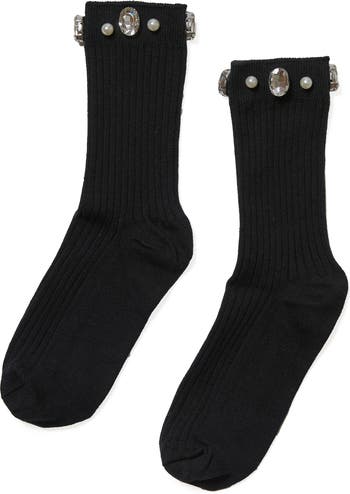 Make your footwork feel extrafancy with these ribbed crew socks glitzed up with sparkling crystals and lustrous faux pearls.