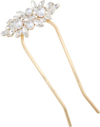 Beautiful crystals and faux pearl adorn a glamorous hair pin that lets you style your hair in a variety of ways while gently keeping your updo securely in place.
