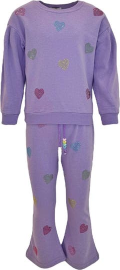 Charming Lavender Crystal Hearts Set with sparkling heart embellishments. Cozy sweatshirt and stylish flared pants for a cute, coordinated look. Ideal for casual outings, playdates, and special occasions.