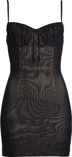 Known for megawatt glamour, the New York brand balances sweet and sultry in this curve-contouring mesh minidress adorned with a bow and scores of glistening crystals.