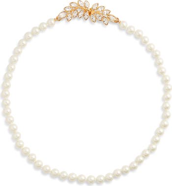 A crystal-leaf clasp adds an extra touch of sophistication to this timeless faux-pearl necklace.