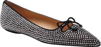 Sparkling crystals and a dainty bow enhance the occasion-ready glamour of this pointy-toe flat.