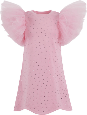 Elegant pink dress adorned with shimmering crystal embellishments for a dazzling effect Features dramatic tulle ruffle sleeves, adding a touch of glamour and volume A-line silhouette ensures a comfortable fit, perfect for special occasions and stylish outings
