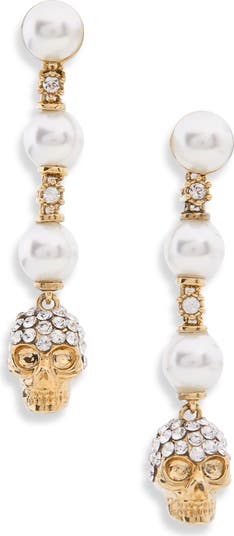 McQueen's macabre edge reigns supreme in these gleaming goldtone drop earrings that combine crystal-studded skulls and lustrous faux pearls into one bold statement.