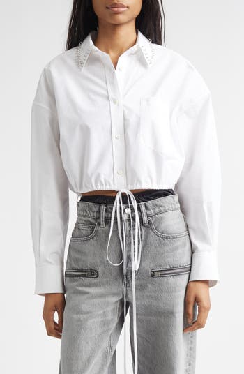 Crystal Stud Crop Drawstring Waist Cotton Button-Up Shirt