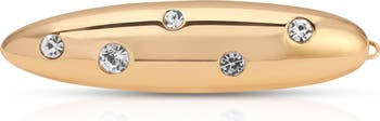 Add a contemporary twist to your hairstyles with this golden barrette—embedded with sparkling crystals—that keeps your tresses in place while reflecting the light with every turn of your head.