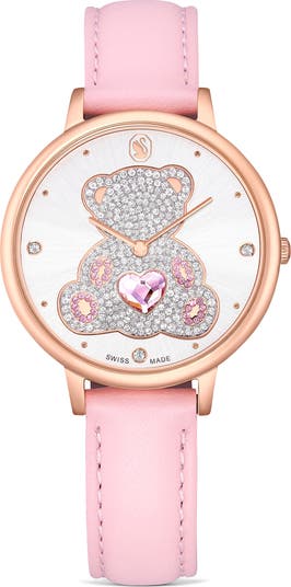 The dial of this charming leather strap watch is embellished with a sparkling crystal-studded teddy bear centered by a faceted pink heart. The rose goldtone–plated watch runs on a Swiss quartz movement and is secured on a pink leather strap.