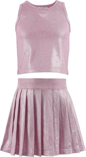 Radiant pink tennis set embellished with sparkling crystal details, offering a captivating and stylish appearance. Includes a fitted sleeveless top and pleated skirt for a sleek and sophisticated ensemble. Perfect for special occasions, parties, or standing out with effortless elegance.