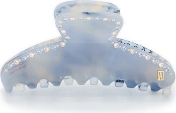 This dreamy acetate hair clip is outlined in pastel Swarovski crystals for an elegant finishing touch.