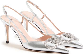 Alessandro Michele fell under the spell of retro references for his first Valentino outings, reviving the gilded VLOGO emblem from the '70s archives—here updated with glittering crystals—for this elegant Italian-leather slingback pump.