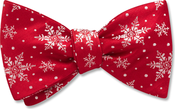 The Crystalline Red bow tie features a stunning snowflake design with sparkling silver thread woven into bright red silk, making it a perfect choice for holiday and winter wear.