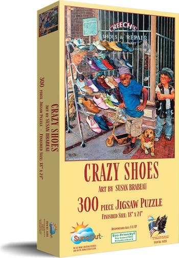 Unleash your imagination with the Zany Shoes 300-piece jigsaw puzzle for adults by SunsOut Puzzles. Featuring the quirky and artistic designs of acclaimed artist Susan Brabeau, this vibrant and eccentric puzzle measures 18" x 24" when completed—offering a playful escape and a delightful addition to any collection. Beyond entertainment, SunsOut Puzzles deliver enduring craftsmanship with precision-cut, interlocking pieces made from durable, recycled cardboard for a smooth and reliable fit. Each puzzle is backed by a worry-free guarantee and meets rigorous quality standards, with exceptional customer service ready to assist with any missing or damaged pieces. Printed using eco-friendly soy-based inks on recycled materials, this puzzle appeals to eco-conscious enthusiasts seeking sustainable and ethically produced products. As a woman-owned small business proudly based in the USA, SunsOut reflects the spirit of American creativity and quality. Dive into a colorful challenge that combines problem-solving, artistic appreciation, and relaxation—perfect for both experienced puzzlers and newcomers alike. Let the Zany Shoes puzzle be your next fun and fulfilling puzzling adventure.