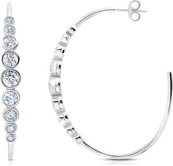 Sterling silver hoop earrings hand set with graduated cubic zirconia bring bold shine to night-out looks.