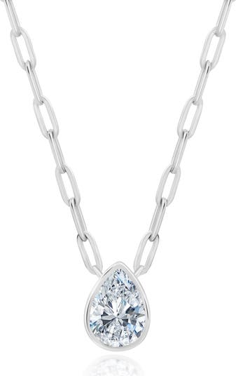 A delicate pear-cut cubic zirconia pendant adds understated elegance to this lovely hand-set necklace plated in sleek platinum.