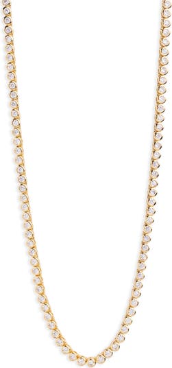 Bezel-set cubic zirconia give modern shape and shine to a classic tennis necklace plated in 18-karat gold.
