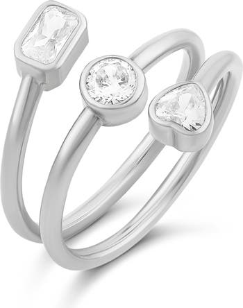Wrap yourself in shine with this spiral ring topped with a trio of cubic zirconia bezels.
